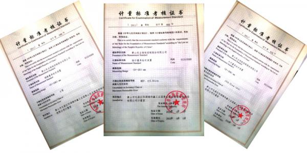 公司根據(jù)市場的變化,本著客戶至上,質量*的原則,公司領導為了更好的確保產品質量,于2007年籌建了公司長度量具檢測計量室,并于2008年順利通過了黃山市市場監(jiān)督管理局的考核,取得了“指示量具檢定裝置”、“測微量具檢定裝置”、“卡尺量具檢定裝置”三個長度計量標準的考核證書。該計量室的建立為公司產品質量的提升提供了堅實的保障,量值有了可追溯性,極大的提高了公司產品質量。